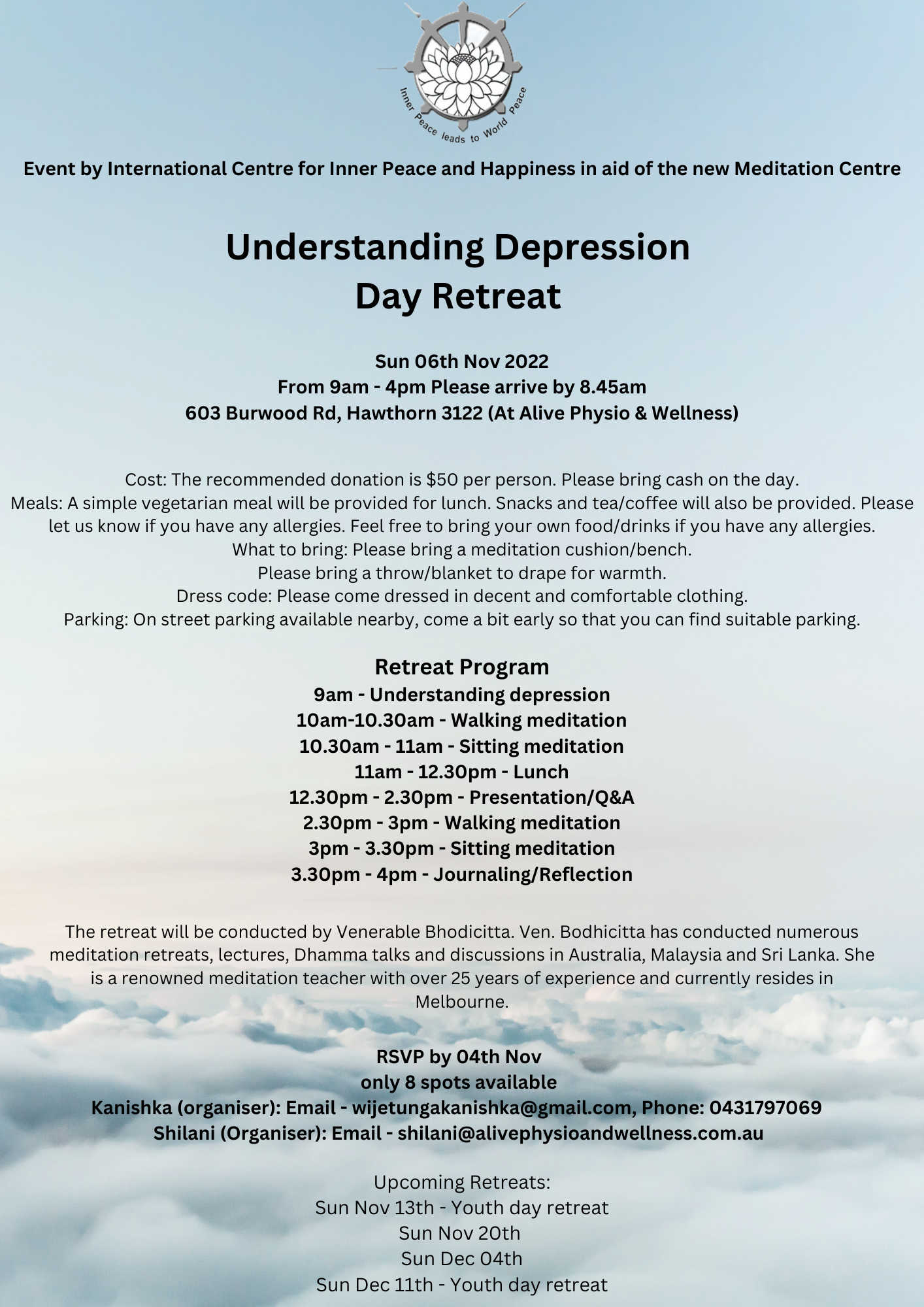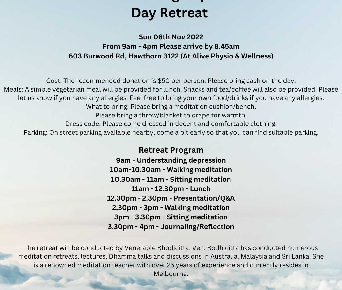 « All Events This event has passed. One day retreat. November 6, 2022 @ 9:00 am – 4:00 pm AEDT For more details and RSVPing please visit the below links. Rsvp link 1 Rsvp link 2 Add to calendar Google Calendar iCalendar Outlook 365 Outlook Live Details Date: November 6, 2022 Time: 9:00 am – 4:00 pm AEDT